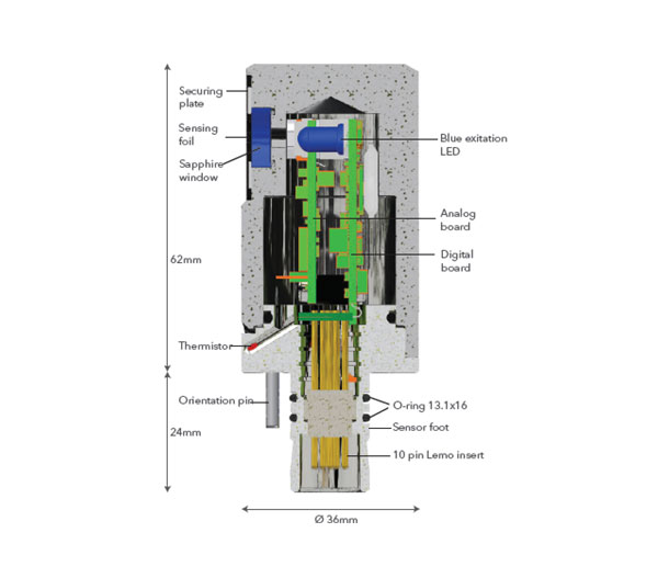 安德拉溶氧探(tàn)頭基於生(shēng)命周期的熒光淬滅測量原理。它采用鉑卟啉配合物(wù)作為熒光(guāng)材料,嵌(qiàn)入在透氣的熒光膜中,一層黑色的光隔離塗層保(bǎo)護熒光材料不受(shòu)太陽光和水中顆粒熒光(guāng)的影響。熒光膜一側暴露於環境水(shuǐ)體,另一側安裝(zhuāng)在測量室的光(guāng)學窗口上。通過藍光激發熒光膜(mó)上的熒光材料,使(shǐ)其(qí)發出紅光,檢測器檢測從發出藍光到釋放出紅光的時(shí)間,該時間與溶氧濃(nóng)度呈線性相(xiàng)關性,再(zài)經過溫度補償後得出(chū)溶氧濃度。基於生命周(zhōu)期的熒光淬滅測量原理(lǐ)與電化學傳(chuán)感器相(xiàng)比具有如下優點: